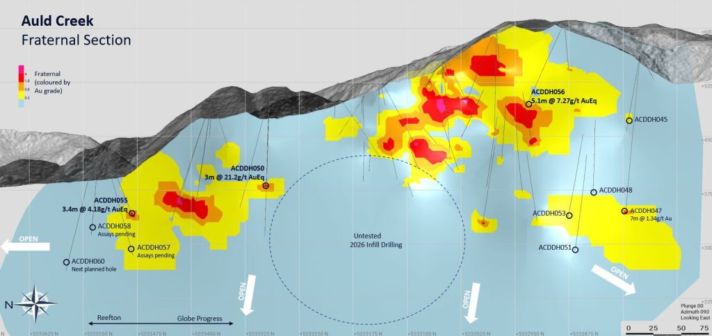 Encouraging new mineral intersections confirm expansion of the Auld Creek system beyond 870m (Fraternal lode), with mineralization remaining open to the north and unconstrained at depths exceeding 320m. A third drill rig is scheduled to commence drilling by the end of January, accelerating resource development and testing anomalies directly along strike of both the Fraternal and Bonanza lodes.